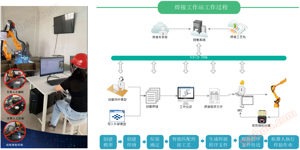 Il sistema è un sistema di sviluppo autonomo, la sua funzione principale è l'integrazione profonda del processo di saldatura, l'importazione del modello tridimensionale, la determinazione della posizione dell'intera saldatura del componente attraverso il sistema visivo, in base al contorno effettivo della posizione nel modello, la generazione automatica del processo di saldatura.